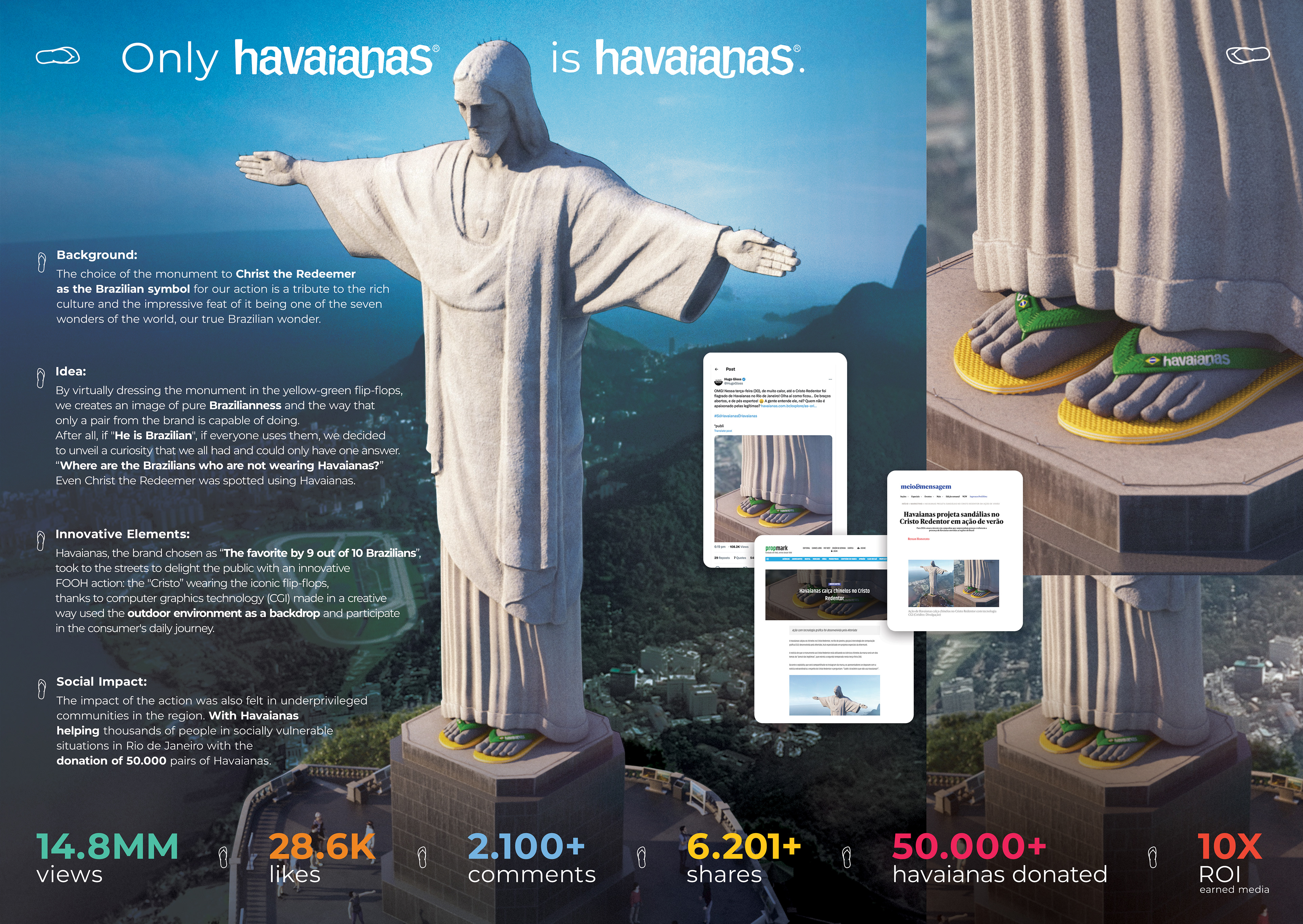 Acompanhando a linha criativa "Todo Mundo usa", (Almap BBDO) revelamos o segredo do maior símbolo do Brasil. No aniversário da cidade Maravilhosa, revelamos que o cristo Redentor, por baixo de sua longa túnica também usa Havaianas. A ação de FOOH, foi um sucesso, sendo visualizado por mais de 14 milhões de pessoas.